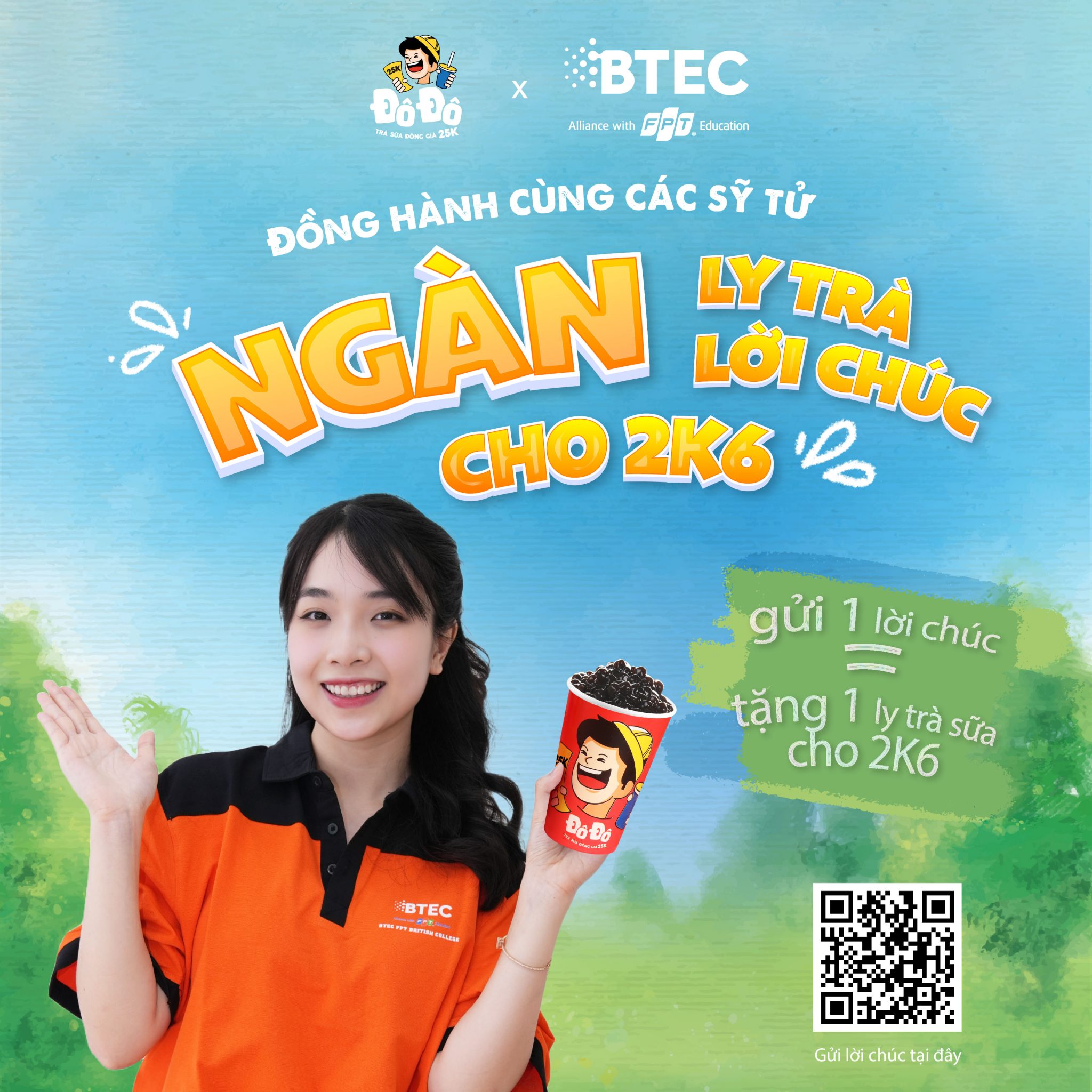 Để lan tỏa thông điệp tích cực và ý nghĩa của chương trình, BTEC FPT hân hạnh có sự đồng hành của hai gương mặt KOLs được giới trẻ yêu mến, Ninh Anh Bùi và Nguyễn Tùng Dương. Với khẩu hiệu “BTEC FPT tặng ‘TEA TỐT’ – 2K6 hốt điểm 10”, Đô Đô tin rằng khi cầm những ly trà sữa ý nghĩa này trên tay, các sĩ tử sẽ cảm nhận được động lực của cả cộng đồng và thêm tự tin hơn trong những ngày thi tốt nghiệp THPT.